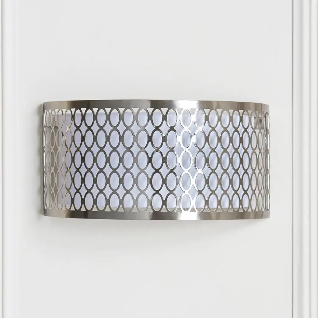 The perfect classic curved wall light, with an elegant geometric metal fretwork outer, plated satin nickel effect with and an inner fabric shade for lovely light diffusion,